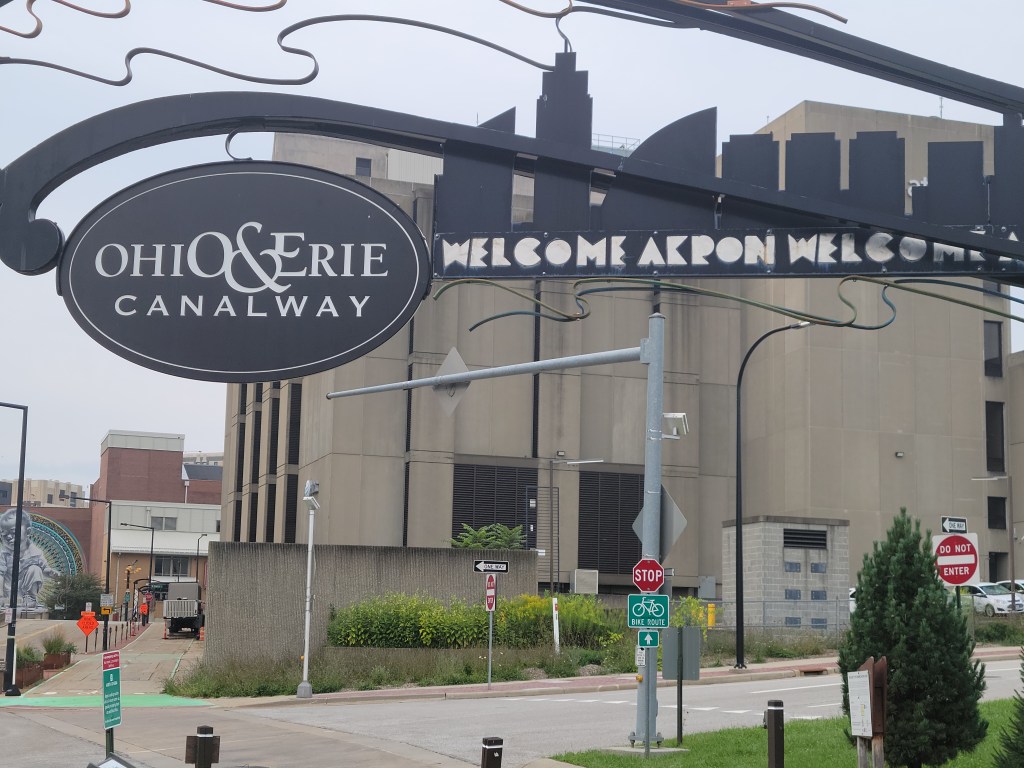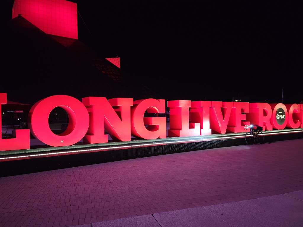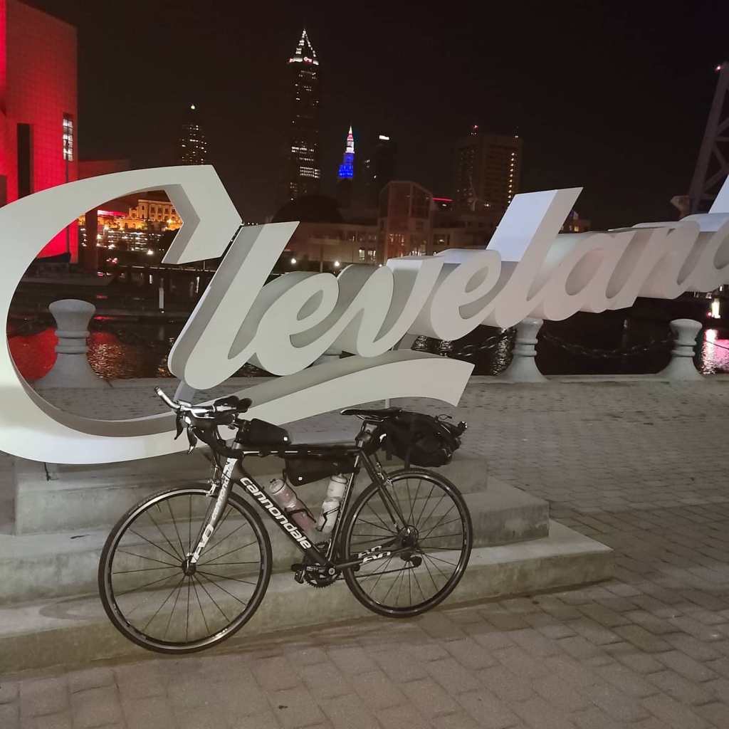 I started at the East 9th St Pier / Rock & Roll Hall of Fame Cleveland script sign (vs Edgewater Park). No significant change in mileage. My daughter lives downtown and I had stayed with her the night before so as to make logistics easier on all. 5:30 AM Rode up East 9th, right on the Superior, over the Detroit bridge, turn left on W 25th, down Franklin on onto the trail. Very dark still. At the 11 mile marker, I enter the Cuyahoga Valley National Park and the trail turns to crushed limestone. I opted to ride my Cannondale Evo 6 carbon road bike for speed and reduced weight. The 23mm road tires did quite well. There were a few small section where it got a bit squiggly but all good. My Fuji Jari gravel bike runs 35s, more stability and comfort, but ave. speed would be 2-3 mph less.