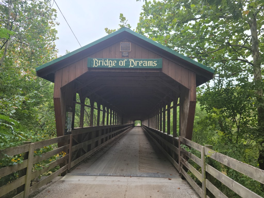 Refilled bottles and picked up some snacks in Apple Creek. Feeling good. My rules were to try and drink 1 bottle of fluid about every 10-15 miles, and was constantly snacking and hitting a GU. Fredericksburg starts the Holmes Co. trail, lot of “Road Apples” LOL. The trail ends in Kilbuck and perhaps my least favorite section on road to Glenmont. Twisting rollers with 45-60mph vehicle traffic ripping by. It also started to rain lightly as I rolled into Glenmont. Flashbacks to the Funk Bottoms Gravel ride which starts there. Now that was a tough day in the saddle!! I am now about 110 miles into my 1st day ride. Back on the gravel trail with what was about 20 minutes of a constant though moderate uphill section; 90 rpm spinning and 11 mph. The rain continues. 😦 This section hosts one of the many major landmarks of the trip, “The Bridge of Dreams,” Ohio’s longest covered bridge spanning the Mohican River. The Mohican Valley Trail brings you into Danville. I stop at the Subway for a small sandwich and more fluids. 20 minutes off the bike and a quick break from the rain, but I cool off quickly being wet and sitting inside in the AC. It will only be 30 minutes total out of the saddle from Cleveland to Westerville. I ride about 300 yards and onto the Kokosing Gap trail. Still raining.