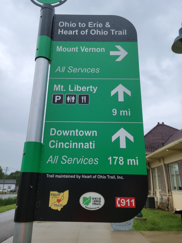 The rain (steady drizzle) continued into Mt Vernon. Some local construction got me spun around for a few minutes, but I re-connected with the Heart of Ohio trail and continued on. By Centerburg, the rain finally ended. Hopped onto one of the road section sections to Sunbury; rolling country roads for the most part. Energy levels running a little low at this point. Just south of the town square in Sunbury I connect with the Galena trail, and start my final push to Westerville/Gahanna. My plan was to get to the Morse Rd trailhead on the Alum Creek Trail but many sections are under water (knee deep in some spots). My daughter Sarah picked me up at the Westerville Rec Center. It was about 7:00 PM, 13 1/2 hours from start time, 181 Miles.