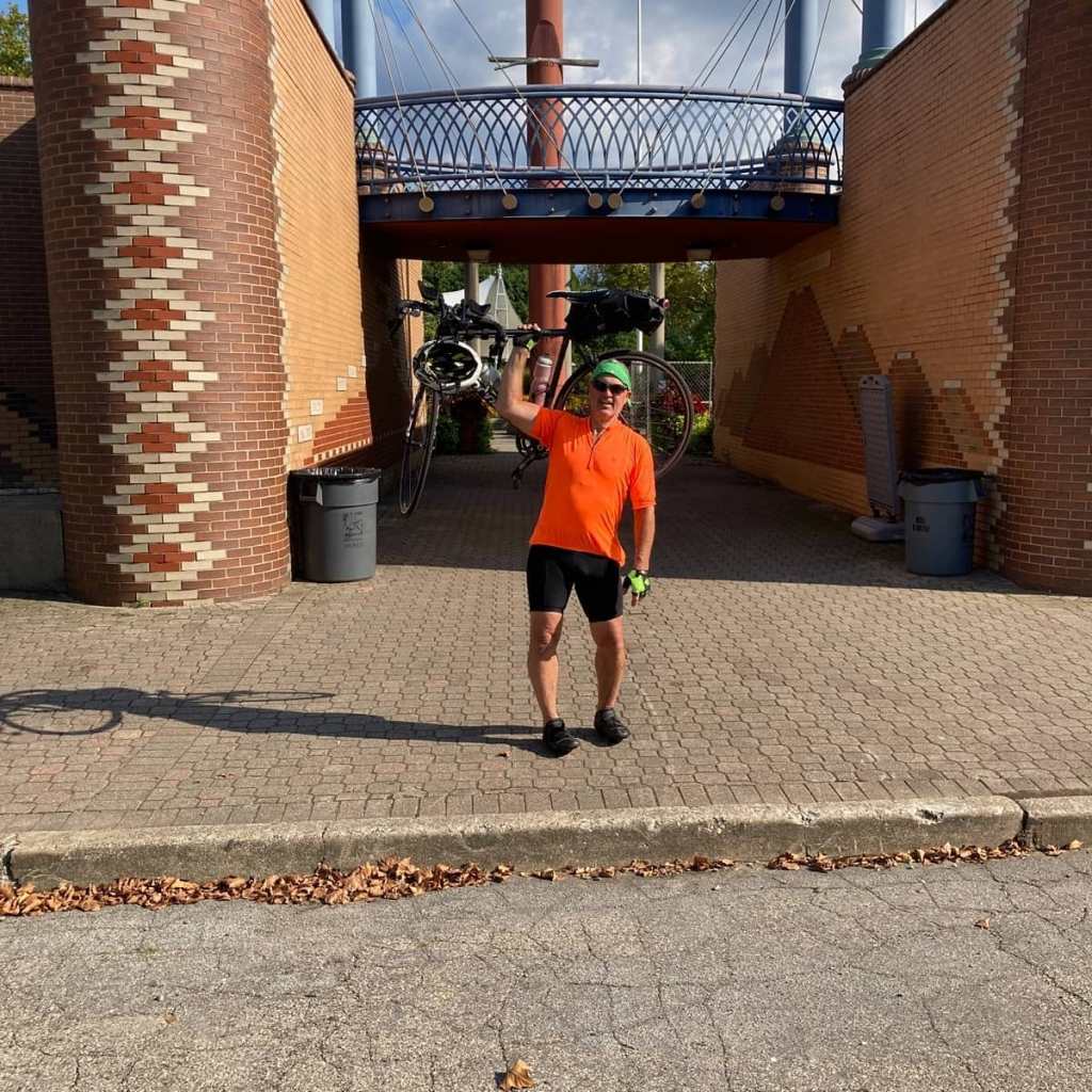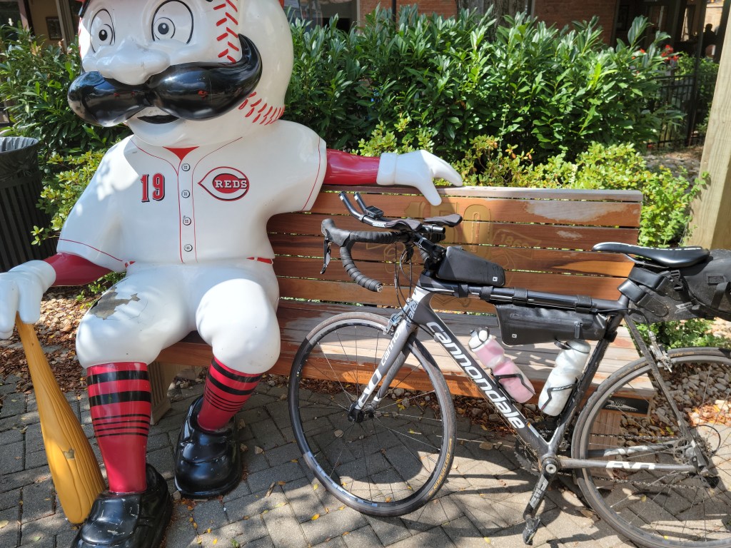 There are a few miles of off trail as you enter London. Stopped for refuel at a gas station then connected to the Prairie Grass trail. Very flat but with some cross winds. I went down on my aerobars, dropped the hammer to Xenia. (I averaged over 18 mph on that section of trail). Xenia is the true HUB of Ohio bike trails. Took a few minutes at Xenia station to chat with some fellow riders, then off to the Little Miami Trail. This trail is very shaded as I ride south with the Little Miami River on my right shoulder. There are a few trail towns like Corwin, Morrow and a few riverside bars where you can stop for a re-fuel. Loveland is next and this town has really developed over the past 20 years and is very bike-friendly as well. Just south of Milford the trail presently ends and goes on-road for the last 11-12 miles. I chose to ride on the sidewalk for a large part of this section (thru Mariemont and Mt Lookout area) until I got to Kellogg Rd/RT52 which had a decent bike lane, though traffic was heavy; near rush hour plus the Reds were playing a home game. Arrived at the waterfront greeted by my brother Kirk, near Great American Ballpark at around 4:00 PM 330 total miles, 23 hrs on the bike. He had a little bottle of bubbly for me and took my picture in front of the Flying Pigs Bridge. Great trip. Very satisfied with my effort.